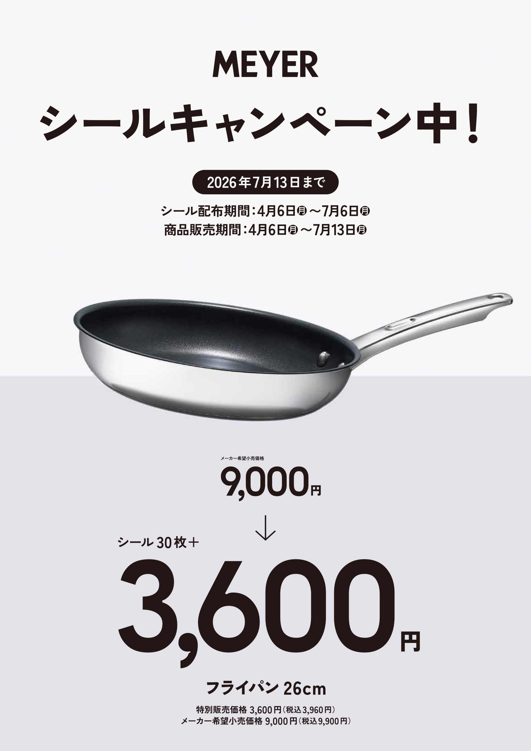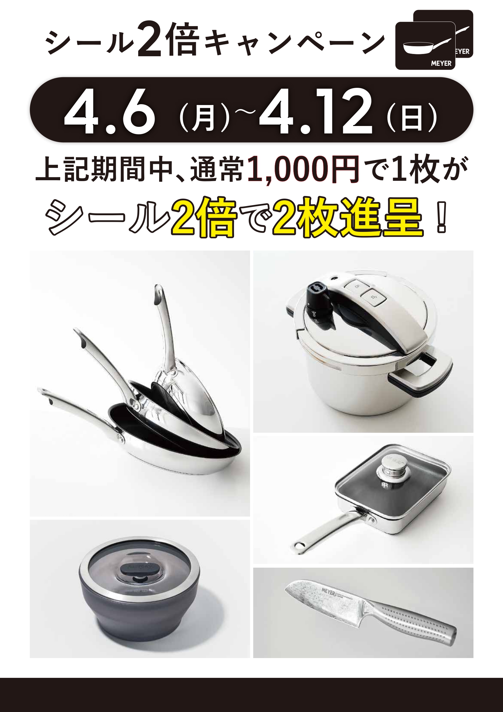 4月12日(日)までシール2倍!MEYERシールキャンペーン開催中! 2026年04月06日 ▶MEYERリーフレットはこちら【対象外店舗】■神戸市内兵庫店、大開店■大阪市内市岡店、大和田店■大阪北部豊中南店■大阪南部富田林店■阪神広田店 トップへ戻る